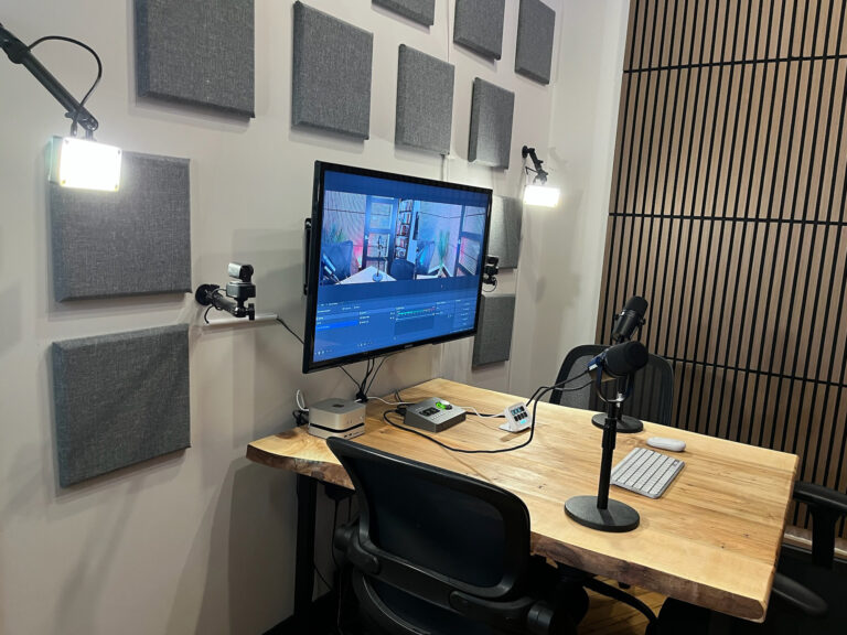 Always setup and ready to record an audio podcast with 3 people or a 4K video podcast with 2 people.